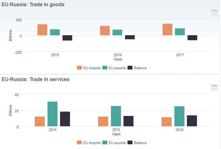 Οι εξαγωγές αγαθών της ΕΕ προς την Ρωσία, όπως φαίνεται και στο παρακάτω διάγραμμα, άγγιζαν το 2017 τα 86,2 δισεκατομμύρια ευρώ, ενώ οι αντίστοιχες εξαγωγές υπηρεσιών τα 24,7 δισεκατομμύρια.