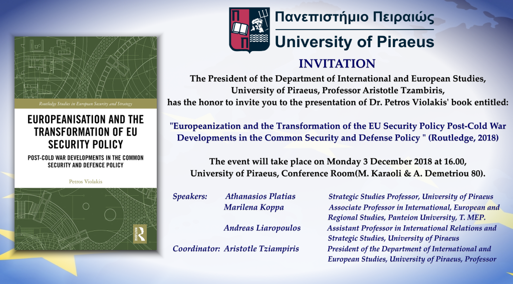 Book presentation: The Director of Research of KEDISA Dr. Petros Violakis presents his book titled: “Europeanisation and the Transformation of EU Security Policy”-Monday 3 December 2018