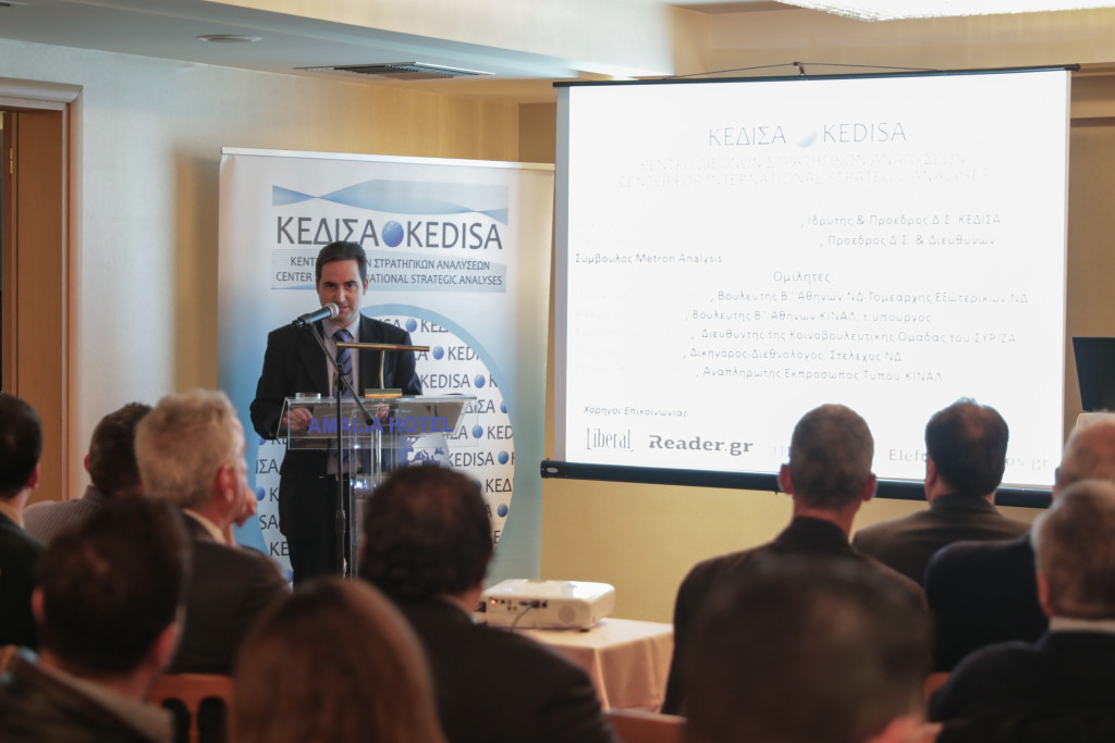 Coordinator of the event was Mr. Andreas G. Banoutsos, Founder & President of KEDISA. Speakers of the event were: Mr. Stratos Fanaras (Chairman of the Board of Directors & CEO of Metron Analysis), Mr. Kostas Zachariades (Director of the SYRIZA Parliamentry Group), Mr. George Koumoutsakos (MP of the Second Constituency of Athens & Head of Foreign Affairs Section of ND), Mr. Andreas Loverdos (MP of the Second Constituency of Athens for KINAL- former Minister), Mr. Demetrios Iatrides (International Relations Expert & Lawyer- ND Official), and Mr Spyros Karanikolas (Deputy Spokesperson for KINAL).