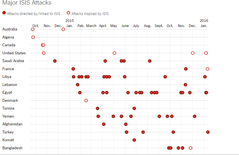 Από το Σεπτέμβριο του 2014 μέχρι και τον Ιανουάριο του 2016, πραγματοποιήθηκαν επιθέσεις που σχετίζονταν άμεσα ή έμμεσα με το Ι.Κ, σε τουλάχιστον 17 χώρες σε ολόκληρο τον κόσμο.