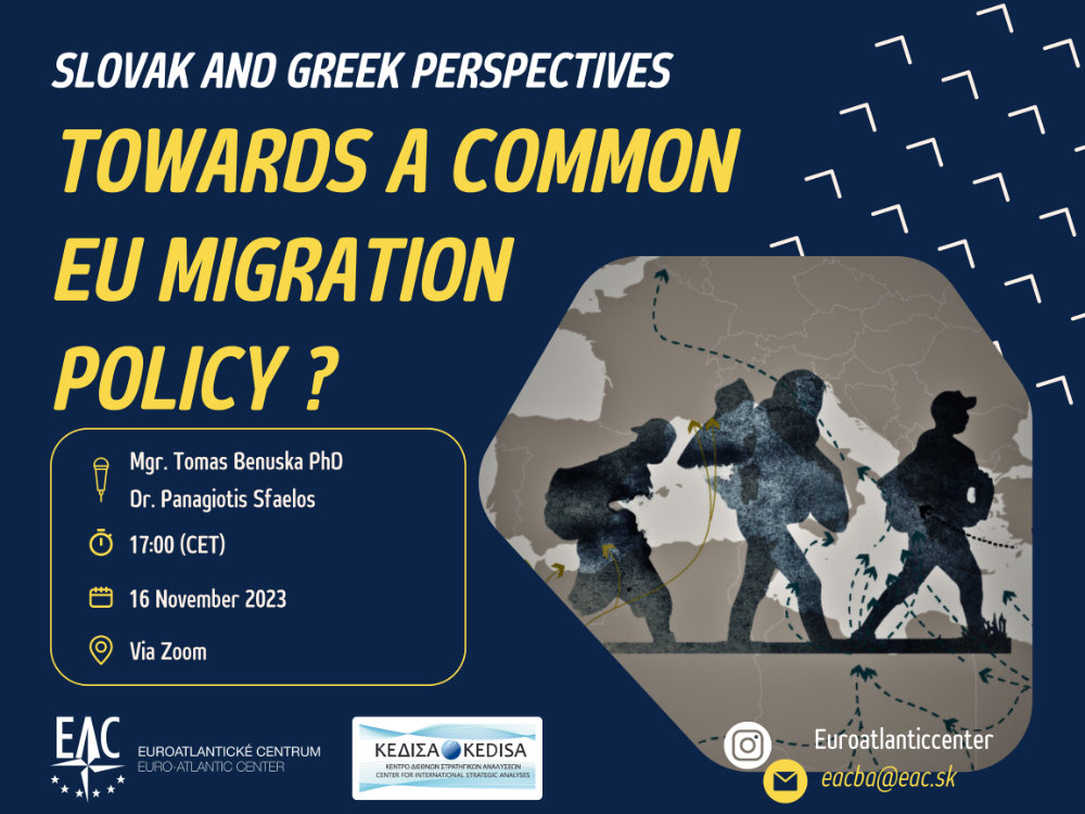Το Κέντρο Διεθνών Στρατηγικών Αναλύσεων-ΚΕΔΙΣΑ συνδιοργανώνει webinar με το Σλοβακικό think tank Euroatlantic Center με θέμα: «Towards a common EU immigration policy? Slovak and Greek perspectives» την Πέμπτη 16 Νοεμβρίου 2023 (18.00-20.00 ώρα Ελλάδος- EET).